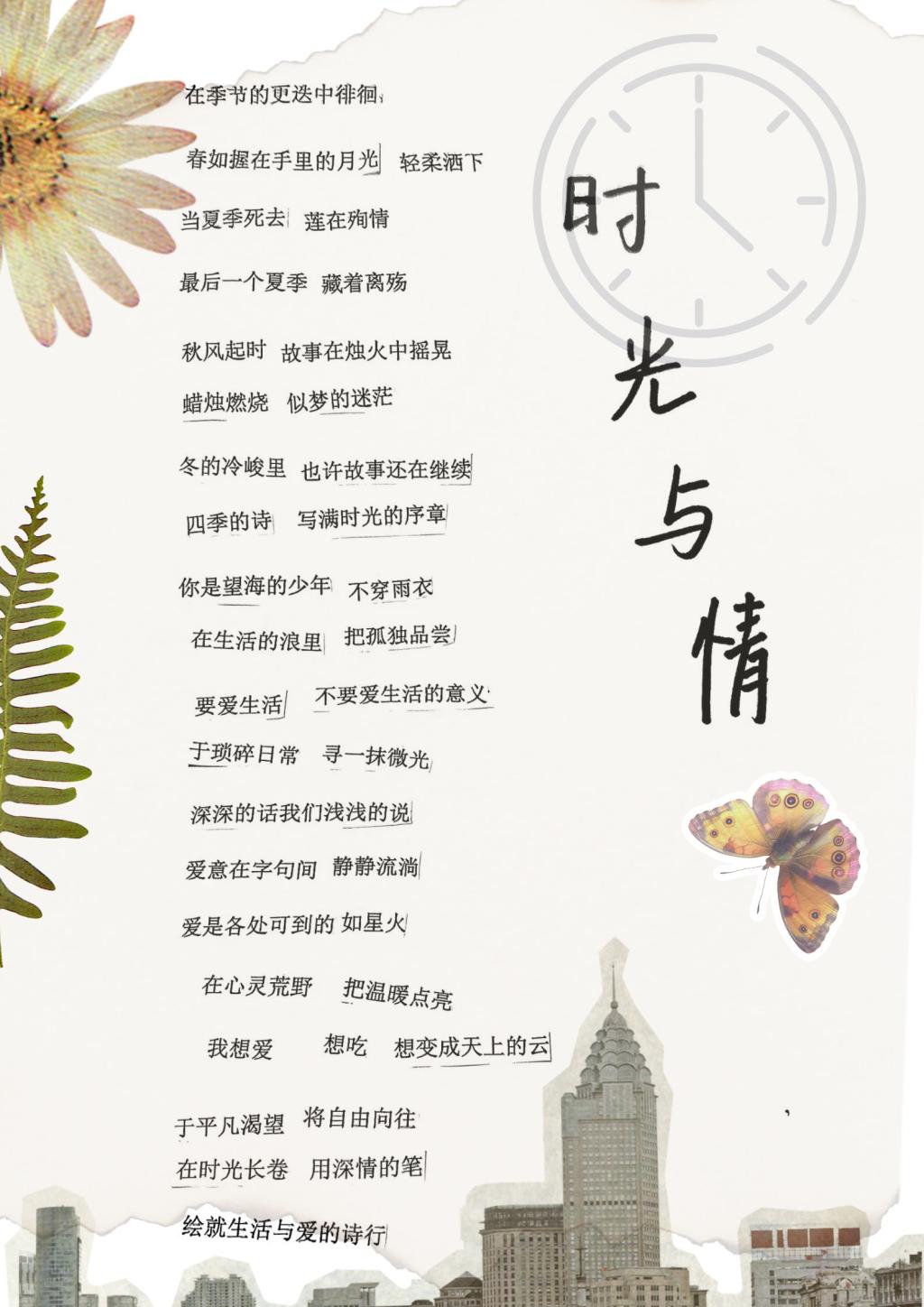 以四季流转为线索,融合对生活、爱情、自我的感悟,展现时光中情感的细腻变化,从季节的象征意趣,到生活态度的思索,再到对爱的期许,表达在平凡日子里对美好、自由与爱的追寻,在时光与情的交织中,挖掘生活真谛,实现思想与情感的升华。