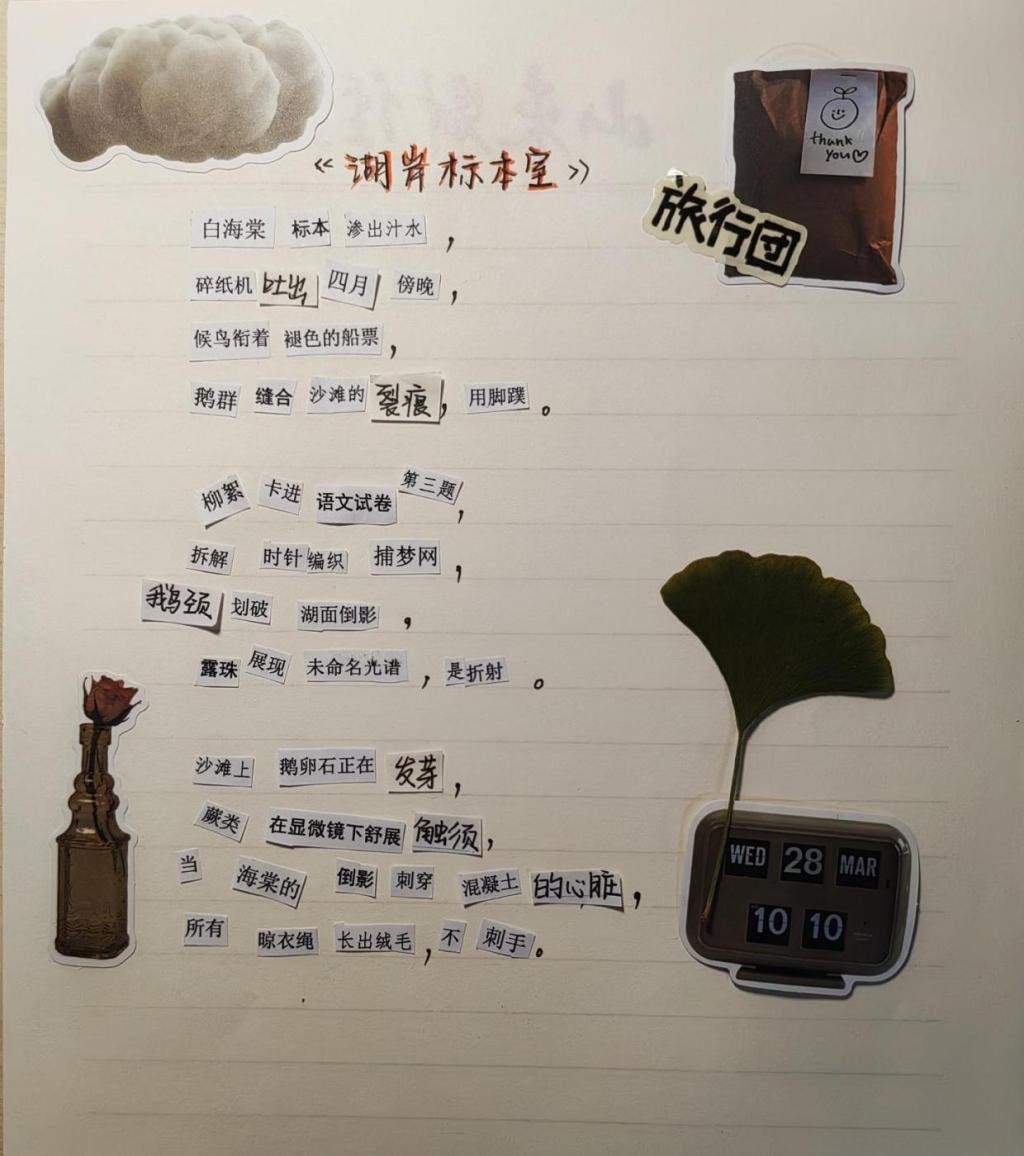 青春剪影,诗意飞扬,国外足球预测网站 成功开展了“意剪生活画,诗写青春风”主题拼贴诗活动。同学们凭借大胆想象力,将看似毫无关联的文字碎片,重新组合成富有深意的诗篇,尽情体验文字碰撞与重组带来的纯粹乐趣,为略显单调的校园生活注入新的诗意,让青春在文字的海洋中绽放别样光彩。