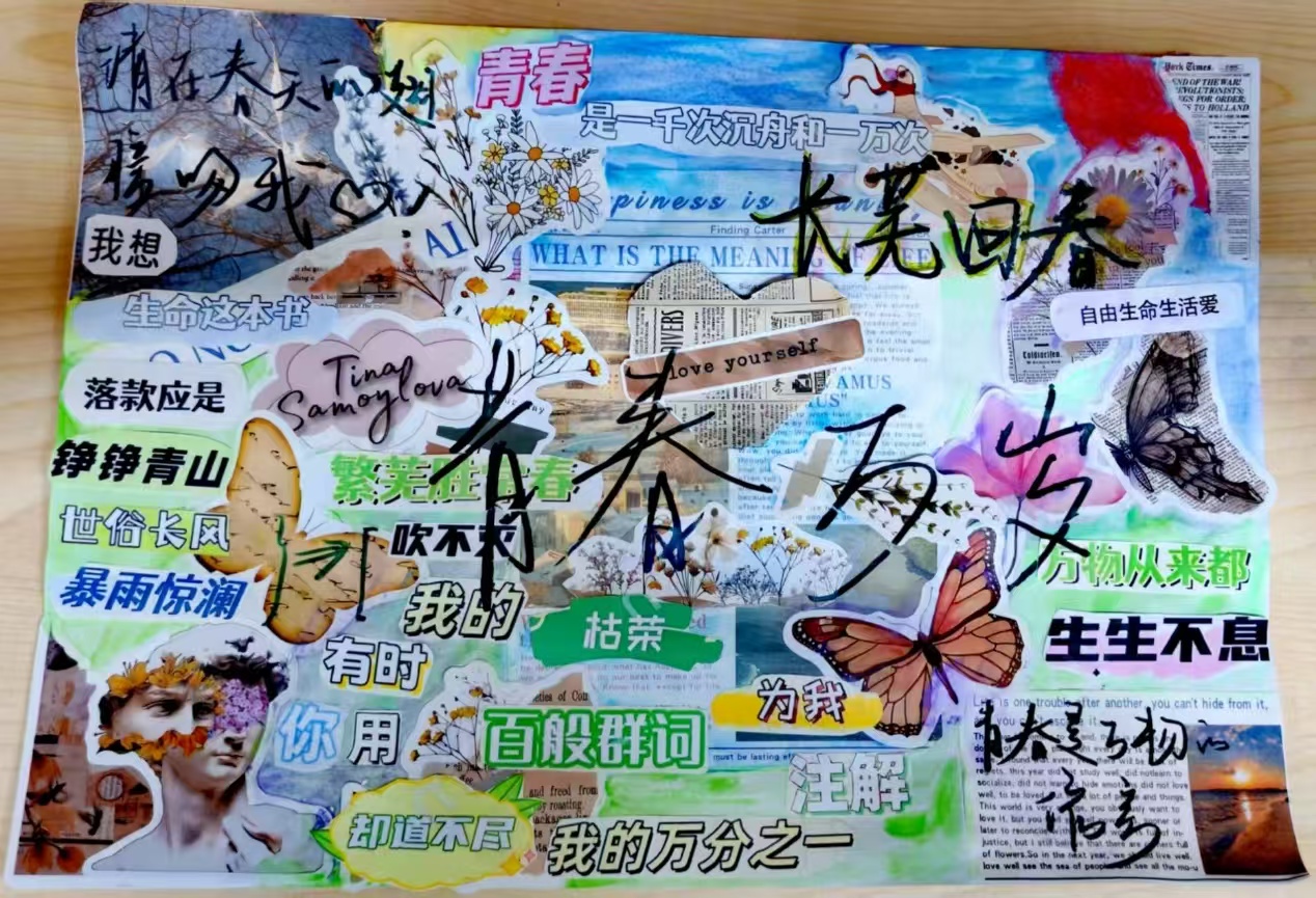 整体而言,这幅拼贴诗借多样词句与意象,把青春的迷茫与勇气、春天的生机、生命的深邃内涵融合,展现对生命历程的思索,传达出珍视自我、拥抱自然、在跌宕中探寻生命意义的期许。恰如“生命这本书”被拆解成散落的词根,有人蘸着雨水写下“自由”,又用风的笔触补上“生生不息”。墨痕如根系蔓延,“枯荣”二字在纸页边缘生根,一半沉入“静静青山”的倒影,一半攀上“暴雨惊澜”的潮头。当“长风”偷走修辞的桎梏,诗便从纸面溢出,成为春天本身——无序,却永远向着光的方向野蛮生长。在碎片与留白之间,青春以文字之羽浮游。那些断裂的句读,是春芽顶破冻土时细碎的裂响——“一千次”与“一万次”的轮回,仿佛时间被折叠成蝶翼,在虚空中震颤出生命的褶皱。