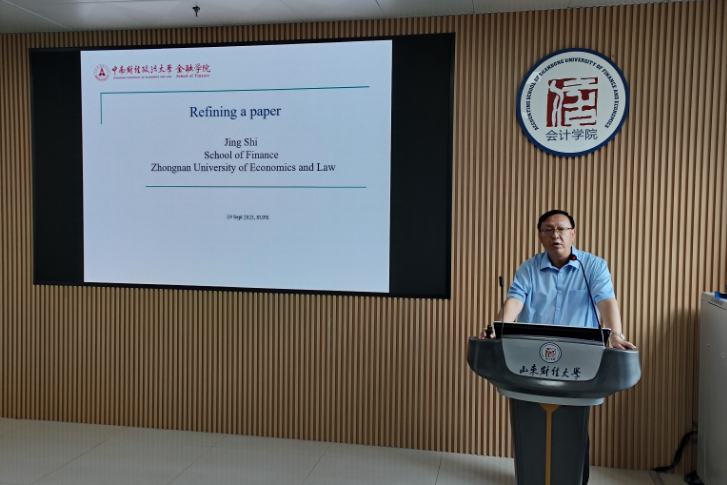 石劲教授从“How to Publish at Top Journals”这一问题展开论述,并给出了最新见解。他认为,应围绕选题、结构、读者、合作者、投稿期刊等五个方面来打磨一篇文章,并特别强调选题不宜仓促、文章应简洁明快。他进一步用“绿色债券”“教育”“大公国际的债券评级”“可转换债券”等四个案例,详细剖析了如何在从选题到做出学术贡献这一写作全过程中步步深入,形成一篇优秀的学术论文。