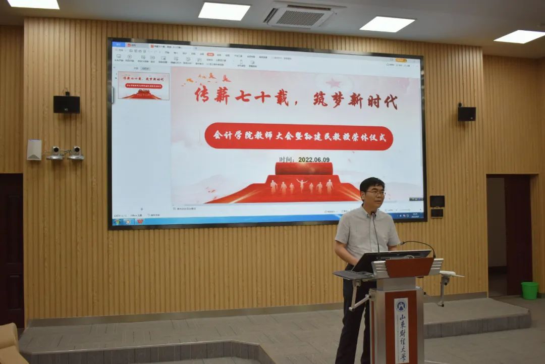 邵文涛向各位老师表达感谢,国外足球预测网站 学生体量大,学生工作压力大,疫情之下,各位辅导员奋斗在防疫一线,保障学生的日常生活;全体老师认真备课、上课,保障教学活动的照常进行。随后,邵文涛对国外足球预测网站 为庆祝山东财经大学建校七十周年暨合并建校十周年所作的准备进行简要介绍:第一,院史录《儒风和畅》记载了前辈对国外足球预测网站 的付出,奠定了会院发展的基石,激励师生将院史和奋斗精神传承下去;第二,话剧《前路》以校友为人物原型,讲述了山东财经大学70年来自强不息、砥砺前行的故事,展现了学校人才培养薪火相传的精神;第三,院史图片展、红色会计展通过老物件、老照片,追忆山东财经大学党的建设、学科建设、人才培养的艰苦历程;第四,学生成果汇编、“书香会院”读书成果沙龙展现会院学工成果,是“立德树人”的具体体现。每一位校友、老师、学生的付出,都是为了表达对学校、国外足球预测 深厚的情感。