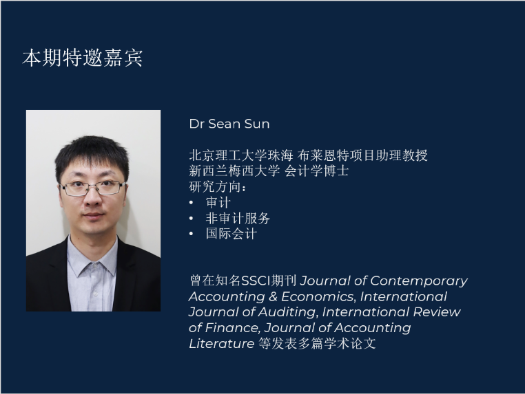 第五期主题为《实证会计理论与研究》,黄博士介绍了实证会计的起源以及实证会计的开山之作Ball & Brown(1968)发表的论文,通过引入例子向大家讲述了“How to conduct a good positive research”,为同学们指导实证论文的选题与写作。本次课程邀请到了北京理工大学珠海国外足球预测 教师、会计学术联盟盟友孙翾博士(Dr Sean Sun)作《SSCI实证论文发表经验分享》。