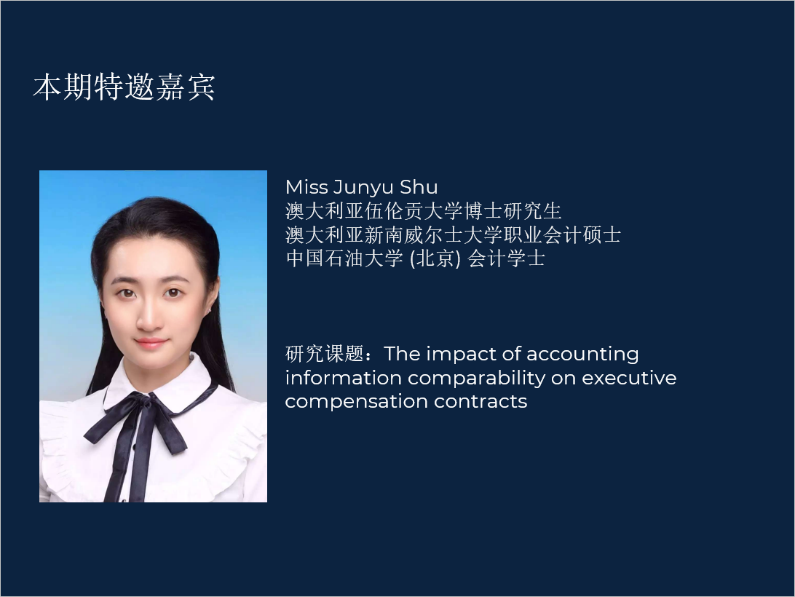 第三期主题为《全球化环境中的会计》,黄博士着重介绍了会计在全球化中的角色,并以IFRS为例,讲述其发展以及现在和未来的研究,最后指出可以进一步研究的问题。本期黄博士还邀请了伍伦贡大学的博士研究生Miss Junyu Shu作了文献拆解分析的示例报告,为同学们完成课程作业作了示例。