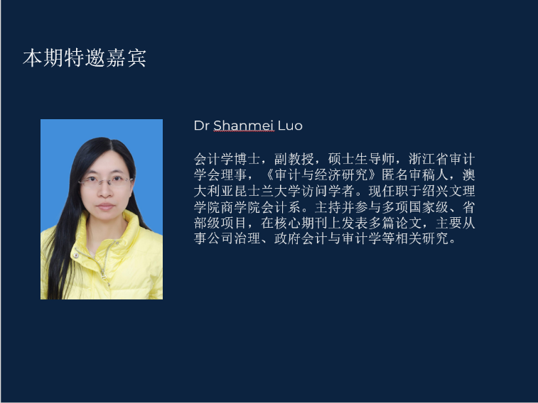 第六、七期主题分别为《阐述与批判会计研究》与《社会与环境会计研究》。在本期中,黄博士介绍了规范会计研究的意义,作为实证会计的质疑与补充,并分享了规范会计文献。针对社会与环境会计研究,黄博士介绍了组织和社会在环境和社会方面的责任和可持续发展问题,并介绍了其研究基础——合法性理论、利益相关者理论与制度理论,同时启发同学们能否用不同的理论来理解公司的行为。黄博士还邀请了绍兴文理国外足球预测 教师、会计学术联盟盟友罗珊梅博士(Dr. Shanmei Luo)就审计理论研究进行了指导。