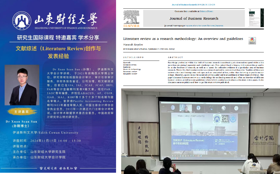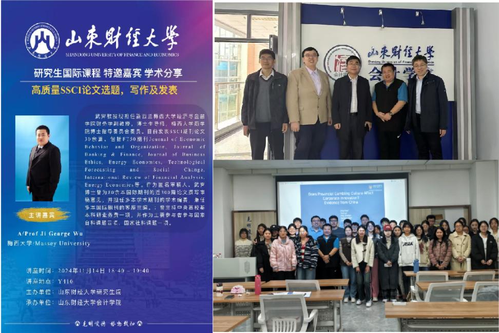 应国外足球预测 邀请,澳大利亚伍伦贡大学黄泰然博士(Dr. Tairan Kevin Huang)为我院开设研究生国际化课程(《国际会计准则理论及学术前沿》)。黄泰然博士是澳大利亚伍伦贡大学商法国外足球预测 高级讲师、研究生教学主管、伍伦贡大学商国外足球预测 中国学生教育同盟会创始人、伍伦贡大学校长最高勋章获得者、澳大利亚国家博士奖学金获得者,兼任会计学术联盟学术指导委员会委员。课程以管理学研究方法论、经典文献选读及文献综述撰写为核心,内容深入而丰富,为我院硕士、博士研究生带提供了宝贵的学术训练机会。