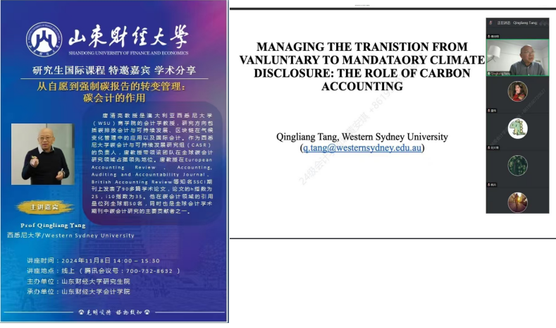 作为第一期讲座的特邀嘉宾,澳大利亚西悉尼大学商国外足球预测 会计学教授、国际知名碳会计专家唐清亮教授为同学们带来了一场精彩的分享,聚焦碳会计领域的核心前沿观点。唐教授围绕国际会计准则委员会即将发布的“可持续与气候相关信息披露标准”,深入分析了碳会计在从自愿披露向强制披露转变过程中的关键作用。他通过案例剖析和数据支持,详细阐述了碳会计如何帮助企业识别碳排放相关风险、优化资源配置,并提升企业在全球市场中的竞争力。