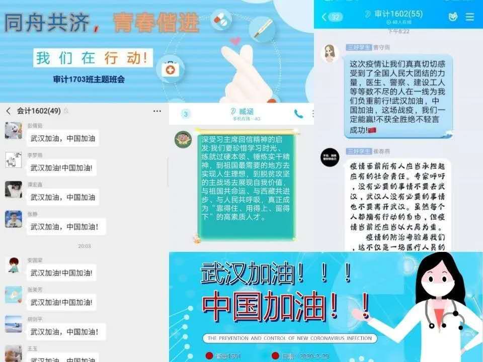 同学们也积极分享了“宅”假期间学习生活的点滴体验,在直播间展开热烈交流。审计1602班的同学们在qq群里,争相表达疫情期间全国上下一心、共克时难的所思所想;2019级智能会计班张心影讲述了作为志愿者参加疫情防控宣传,为居民测量体温,帮助社区维护安全秩序的经历与感受;会计1807班臧涵分享了习总书记回信精神的感想,审计1703班制作了疫情科普的班会ppt,向最美“逆行者”们致敬。