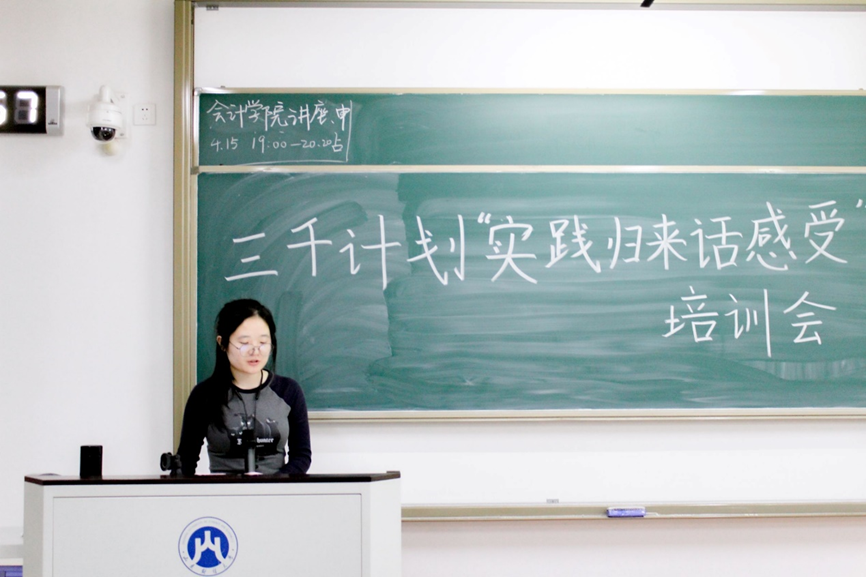 刘晓妮和贺歆茹从“什么是三千计划”和“怎样做好三千计划”两个层次剖析了“三千计划”的内涵及流程,以自身实际经验鼓励同学们积极投入到社会实践中,经真风雨、见真世面、长真才干。阐明一个好团队应发挥队长作用、团结通信、各司其职,使同学们充分认识到“三千计划”的重要作用以及如何发挥团队力量,达到“1+1>2”的效果。